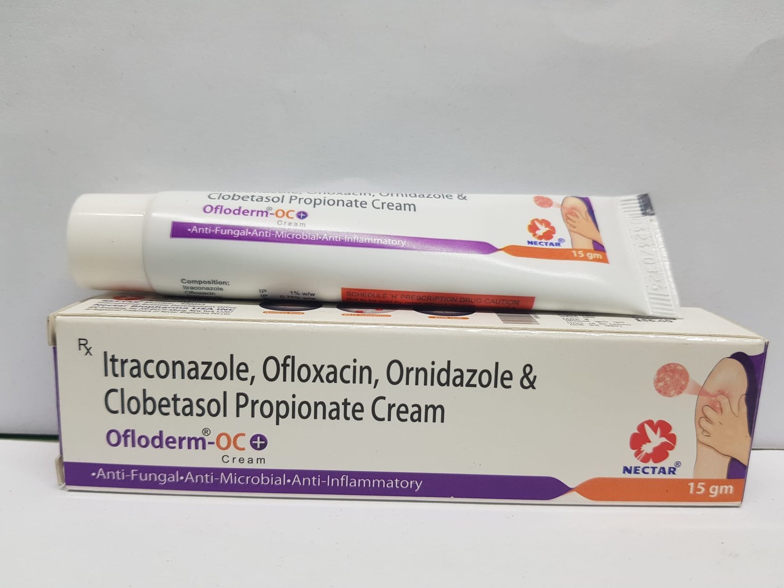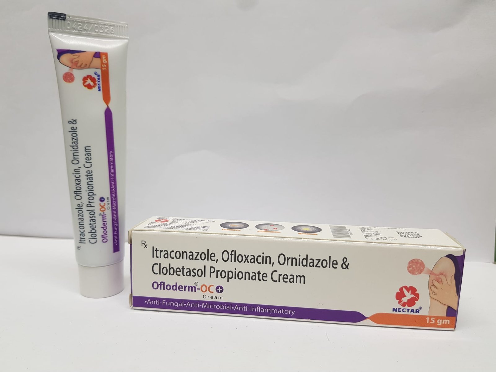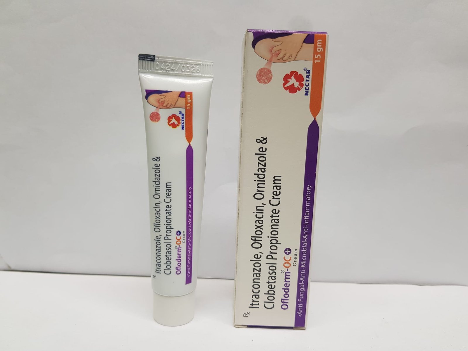 Ofloderm-OC+ Cream is a multi-purpose dermatological treatment designed to combat stubborn skin infections with a powerful four-drug combination. Formulated with Itraconazole, Ofloxacin, Ornidazole, and Clobetasol Propionate, this cream provides wide-spectrum action against fungal, bacterial, protozoal infections and skin inflammation.