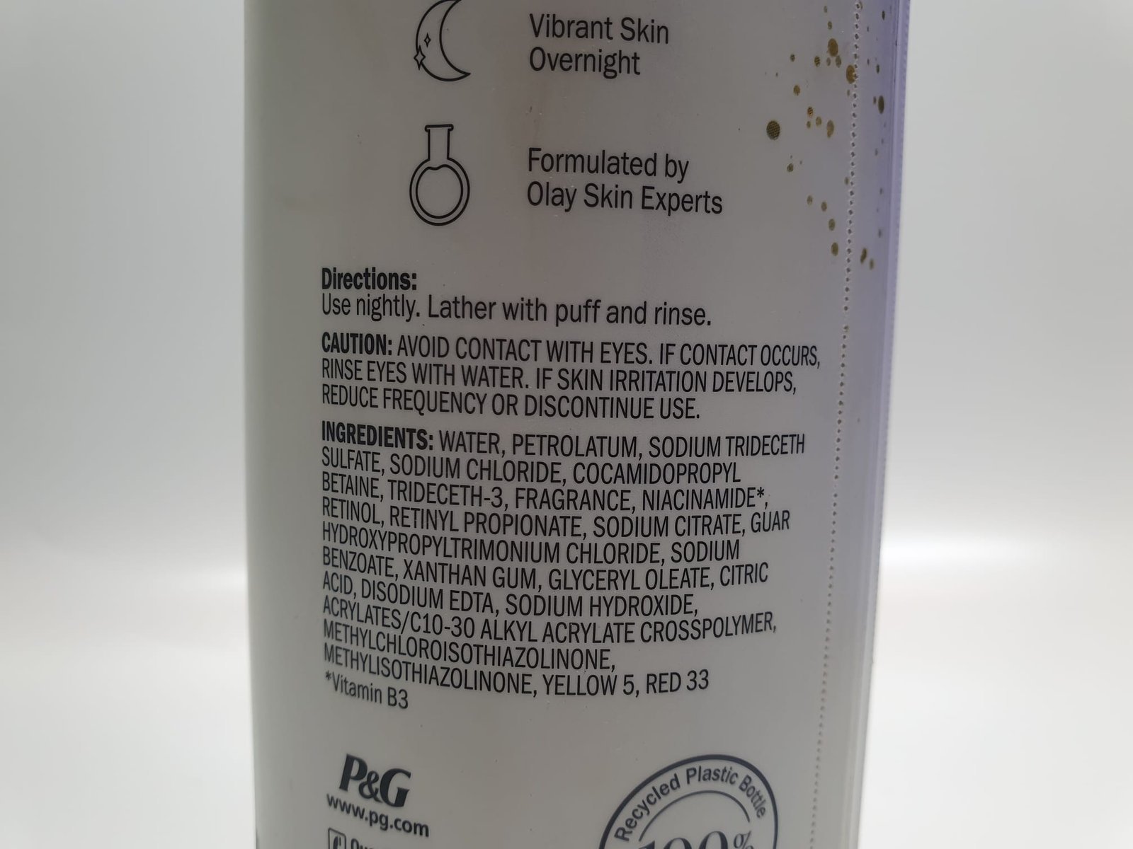 Water, Petrolatum, Sodium Trideceth Sulfate, Sodium Chloride, Cocamidopropyl Betaine, Trideceth-3, Fragrance, Niacinamide (Vitamin B3), Retinol, Retinyl Propionate, Sodium Citrate, Guar Hydroxypropyltrimonium Chloride, Sodium Benzoate, Xanthan Gum, Glyceryl Oleate, Citric Acid, Disodium EDTA, Sodium Hydroxide, Acrylates/C10-30 Alkyl Acrylate Crosspolymer, Methylchloroisothiazolinone, Methylisothiazolinone, Yellow 5, Red 33.