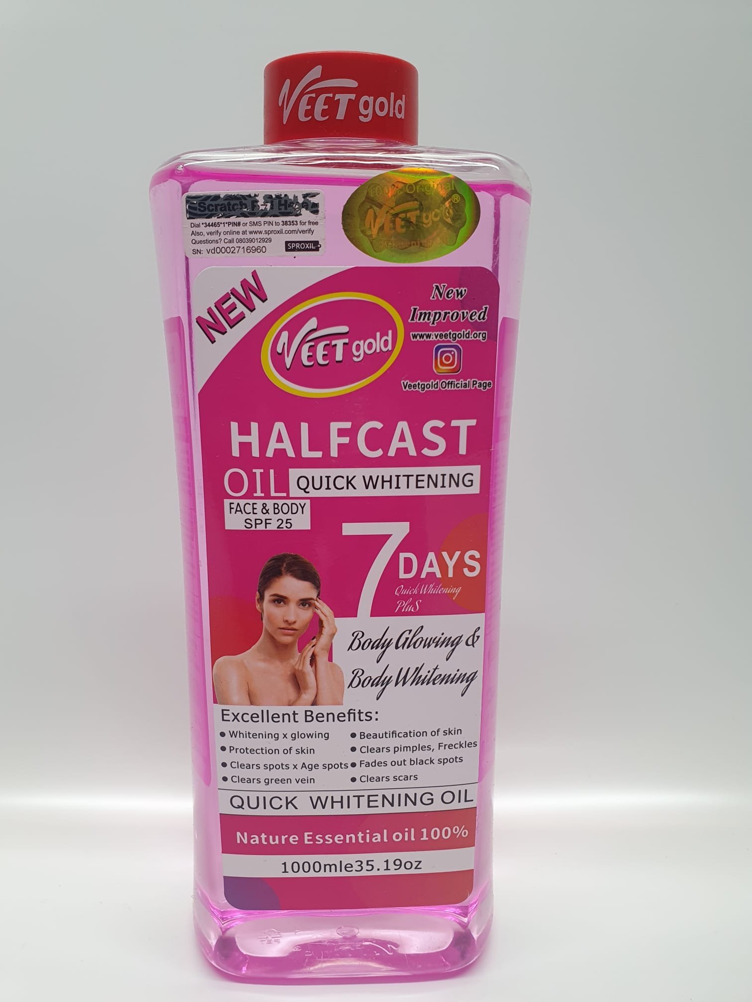VeetGold Half Cast Oil brightens, nourishes, and repairs skin in 7 days. With SPF 25 and pure plant extracts, it fades dark spots and evens skin tone for radiant glow.